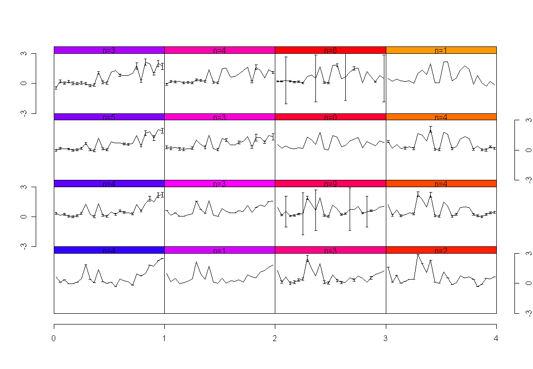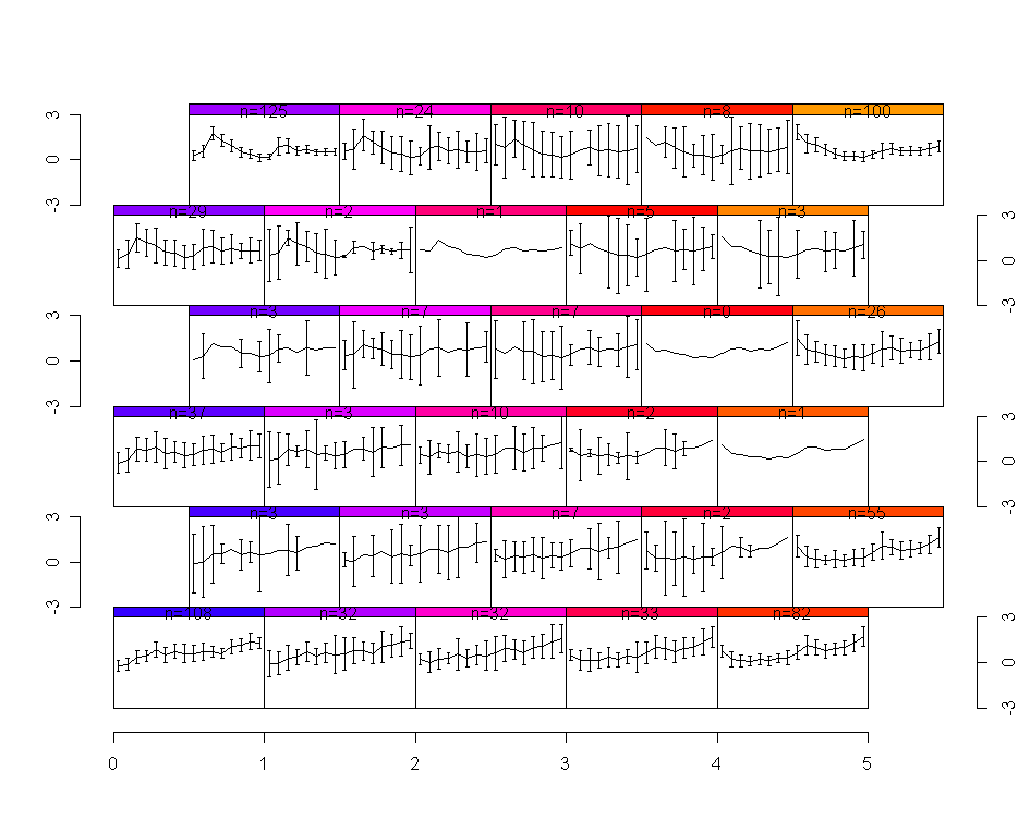 A SOM calculated on the twoday-survey data, with a 4x4 grid, and pre-ordered columns: